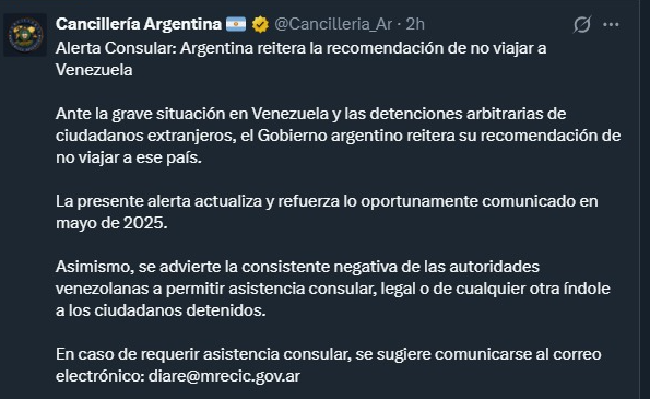 El Gobierno del país suramericano ya había emitido una alerta similar en mayo de 2025, pocos días antes del anuncio de la salida de Venezuela con destino a Argentina de la pareja e hijo del gendarme argentino Nahuel Gallo, detenido en el país caribeño desde diciembre de 2024 y acusado de presunto terrorismo.