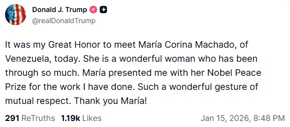 El presidente de Estados Unidos, Donald Trump, se pronunció este jueves 15 de enero a través de su red social, Truth Social, tras el encuentro de más de dos horas mantenido en la Casa Blanca con la líder de la oposición democrática venezolana, María Corina Machado. El mandatario calificó la reunión como un «gran honor» y reveló detalles sobre el gesto simbólico de la ganadora del Premio Nobel de la Paz 2025 hacia su gestión.