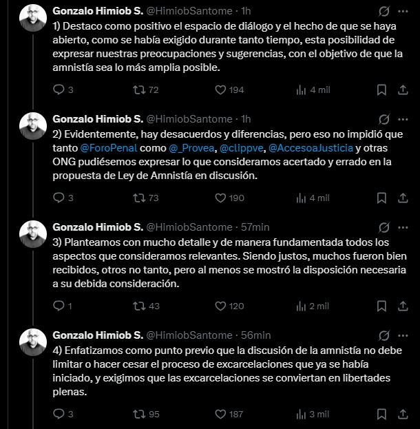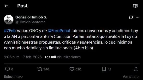 A través de un hilo publicado en su cuenta oficial de X (antes Twitter), Himiob detalló que varias ONG, entre ellas Foro Penal, Provea, Clippve y Acceso a la Justicia, acudieron a la convocatoria de la Comisión Parlamentaria encargada de evaluar la Ley de Amnistía, donde expusieron sus planteamientos “con mucho detalle y sin limitaciones”.