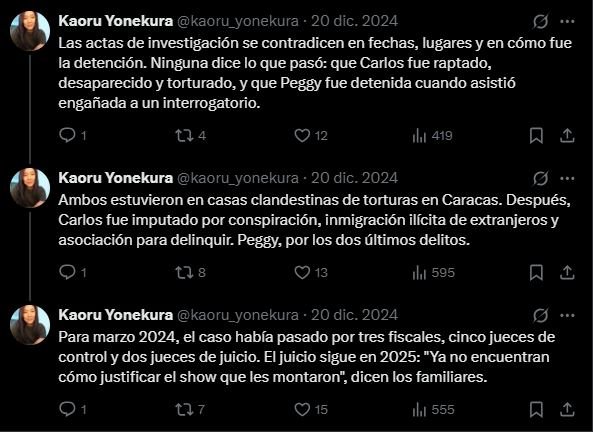 A través de su cuenta oficial en X, la organización informó que el capitán Carlos Piña fue condenado a 14 años de prisión, mientras que Peggy Morales, Edilio Piña y Yasmina Guilarte recuperaron su libertad después de permanecer detenidos durante más de dos años sin sentencia.
