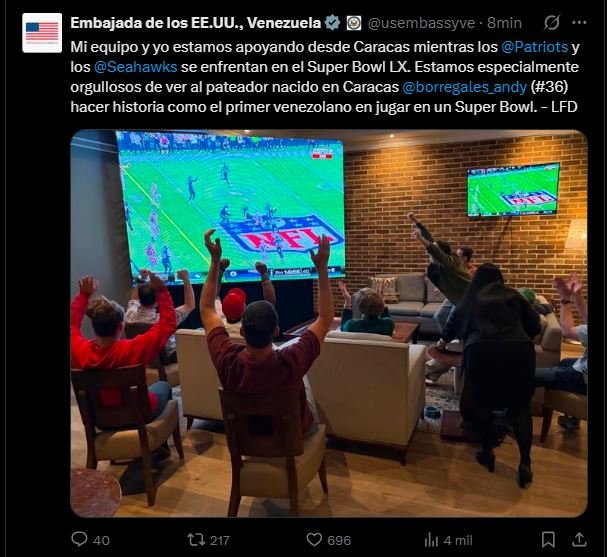 «Mi equipo y yo estamos apoyando desde Caracas mientras los @Patriots y los @Seahawks se enfrentan en el Super Bowl LX. Estamos especialmente orgullosos de ver al pateador nacido en Caracas @borregales_andy (#36) hacer historia como el primer venezolano en jugar en un Super Bowl», dice el mensaje.