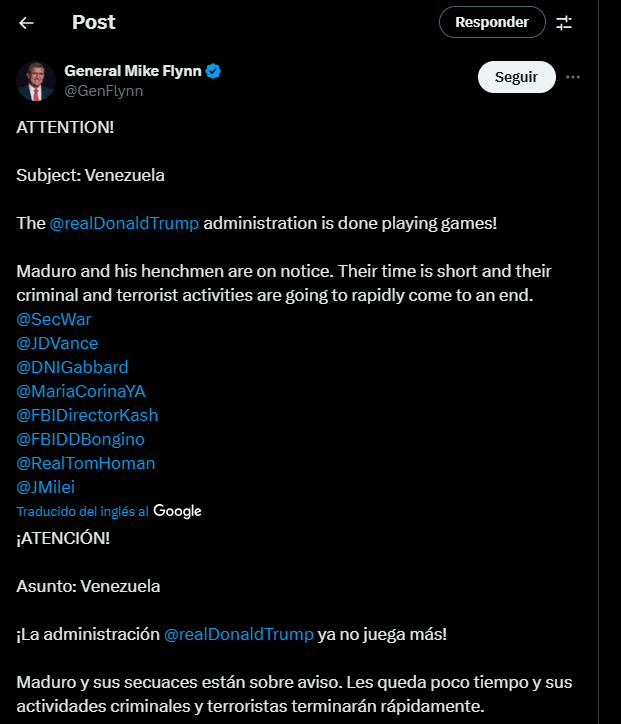 “¡La administración de Donald Trump ya no juega más! Maduro y sus secuaces están sobre aviso. Les queda poco tiempo y sus actividades criminales y terroristas terminarán rápidamente”, escribió Flynn.