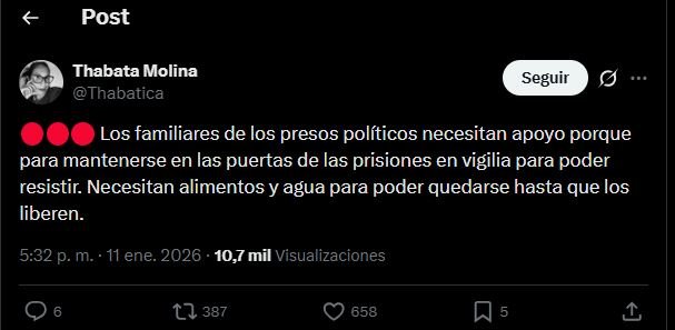 Thabata Molina, reconocida comunicadora con más de 125,000 seguidores en X (@Thabatica), publicó el 11 de enero una serie de mensajes destacando la necesidad de asistencia para las familias que se mantienen en vigilia fuera de prisiones como Rodeo I, El Helicoide, Tocuyito, Tocorón, Yare y Zona 7.