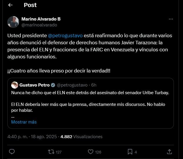 En un revelador intercambio en redes sociales, el activista de derechos humanos Marino Alvarado respondió a un comentario del presidente colombiano Gustavo Petro, quien finalmente admitió la presencia del Ejército de Liberación Nacional (ELN) en territorio venezolano.