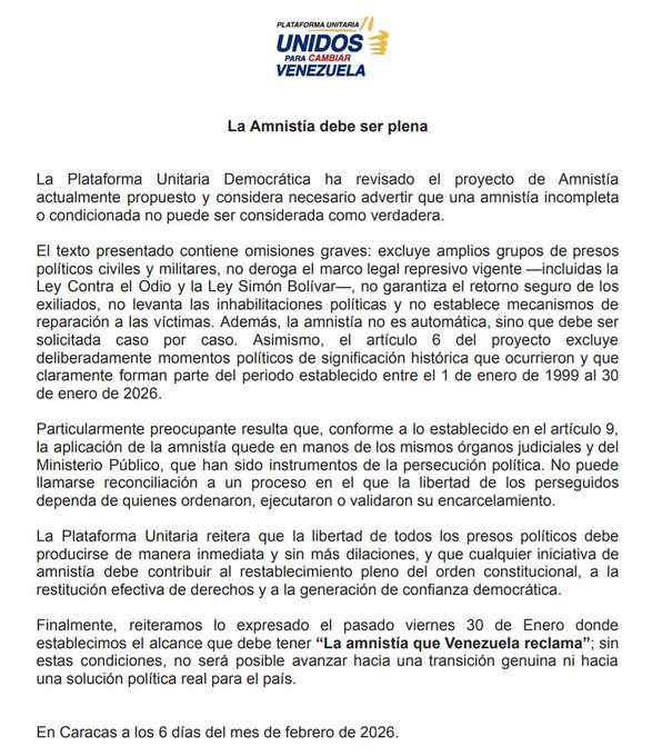La Plataforma Unitaria Democrática (PUD) emitió un comunicado oficial este viernes 6 de febrero en el que fija posición sobre el proyecto de Ley de Amnistía discutido recientemente, advirtiendo que el texto actual contiene «omisiones graves» y no garantiza una verdadera reconciliación nacional. La coalición opositora sentenció que «una amnistía incompleta o condicionada no puede ser considerada como verdadera».