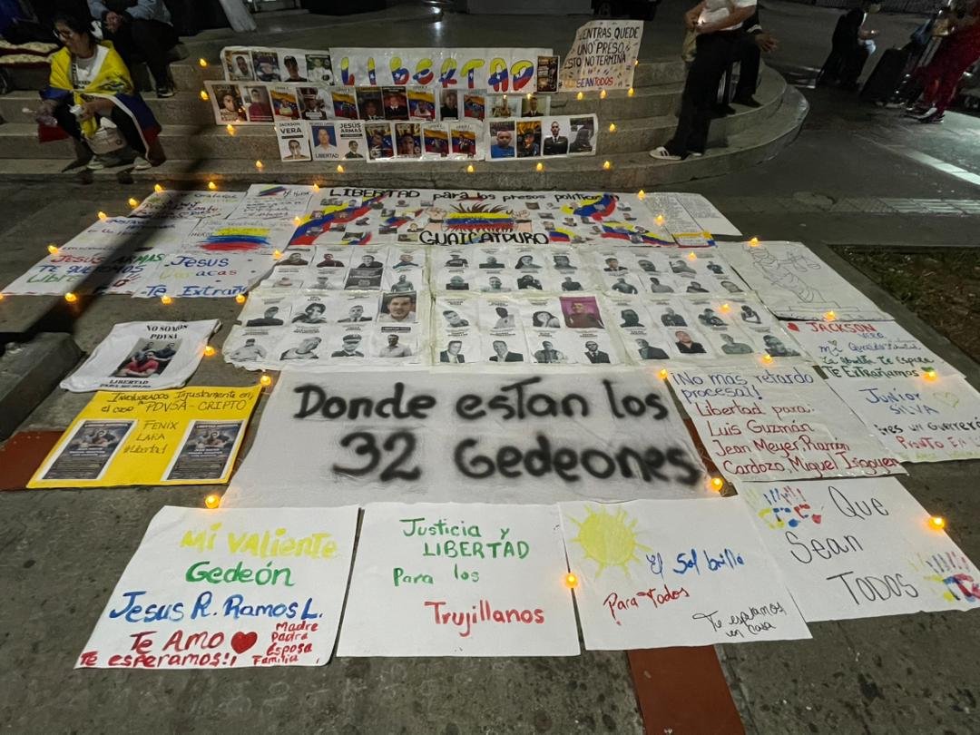 Imágenes del evento muestran carteles con nombres de presos como «Donde están los 32 Gedeones», «Libertad para Todos» y fotos de detenidos, iluminados por velas y luces, simbolizando esperanza y resistencia.
