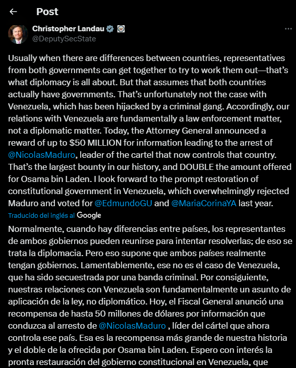 En su mensaje, el subsecretario anunció una recompensa histórica de hasta 50 millones de dólares por información que lleve al arresto del presidente venezolano, Nicolás Maduro, líder del cártel que controla Venezuela.